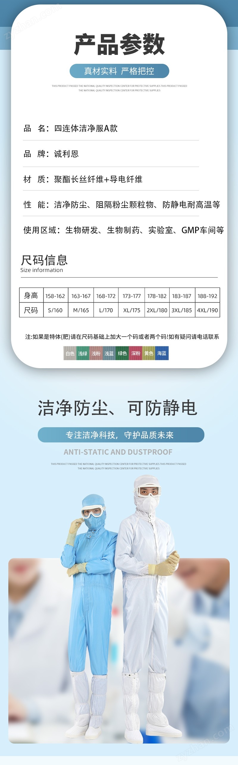 Modelo a de ropa limpia para el taller de la fábrica farmacéutica de cuatro conexiones(sombreros, blusas, pantalones, fundas para los pies); Los botones de cinco garras del cuello y la mandíbula inferior se aprietan, la cremallera resistente a la esterilización de alta temperatura de la blusa ykk, los puños más la correa del pulgar, y los pies están elásticos. 2 / 3 seda antiestática de celosía cuadrada oblicua 0,45: poliéster de filamento + fibra de seda conductora importada; YKK es resistente al lavado repetido, a alta temperatura, humedad y esterilización térmica cremallera; El ganchillo es elástico.